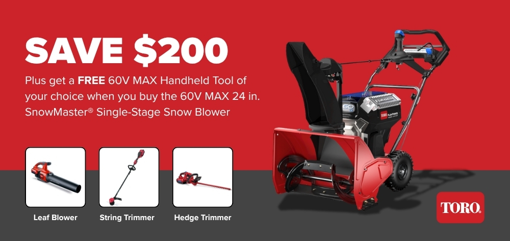 Get ready for winter with the Toro 39914 E SnowMaster. Enjoy a $200 rebate with your purchase. Plus, choose a free Toro 60V tool — Leaf Blower (Model: 51821), String Trimmer (Model: 51832 ), or Hedge Trimmer (Model: 51841) — complete with battery and charger.